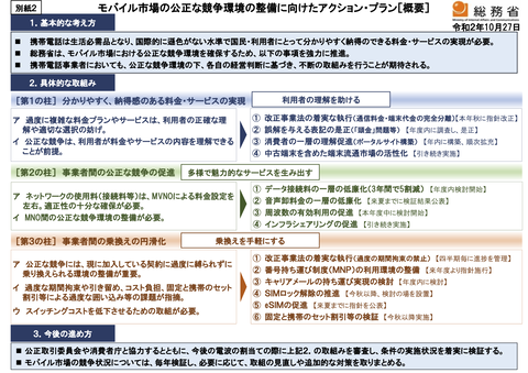 27日、総務省は「モバイル市場の公正な競争環境の整備に向けたアクション・プラン」を発表した。同日午前の武田良太総務大臣による会見で、その意義を語った。アクション・プランの内容は、大手3キャリアの現行料金プランに対して直接的な値下げを求めるものではなく、サブブランドや、格安スマホなどと呼ばれるMVNOのサービスへ乗り換えやすくするための取り組みとなった。続きはソース