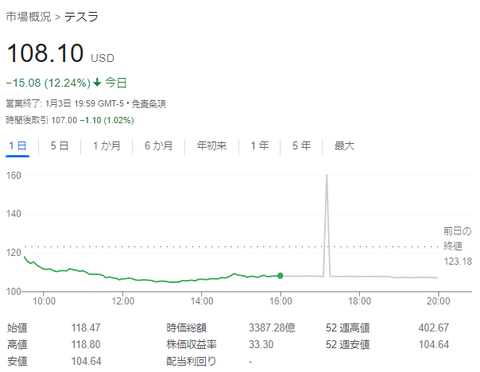 今年初の取引となった3日の米株式市場で電気自動車(EV)大手テスラ株が12%以上急落した。需要低迷に加え、物流の問題で納入台数が予想を下回ったことが嫌気された。