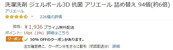 こちらの記事に続いてアリエールも半額クーポンが登場しています!半額対象は「洗濯洗剤 ジェルボール3D 抗菌 アリエール 詰め替え 94個(約6倍)」「洗濯洗剤 ジェルボール3D 部屋干し アリエール 詰め替え 94個(約6倍)」の2種類。(クーポンが表示されなくなっていたら終了です。値段に変動がある可能性がありますのでリンク先にてご確認お願い致します。)ジェルボール3D 抗菌 アリエール:https://amzn.to/2Q6z7dTジェルボール3D 部屋干し アリエール:https://amzn.to/391w2o5