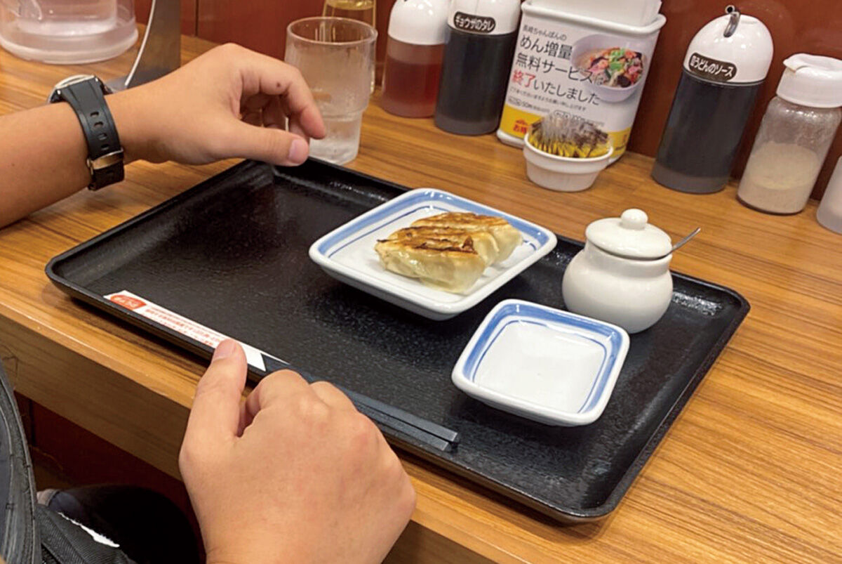 スマホはなんと7台持ちだ専用端末にスマホをかざして来店ポイントゲット。ウエストポーチには大量のスマホが注文した無料サービスの餃子はたったの3個だが、昼食をこれで済ませることも。タダが何よりのスパイスだという