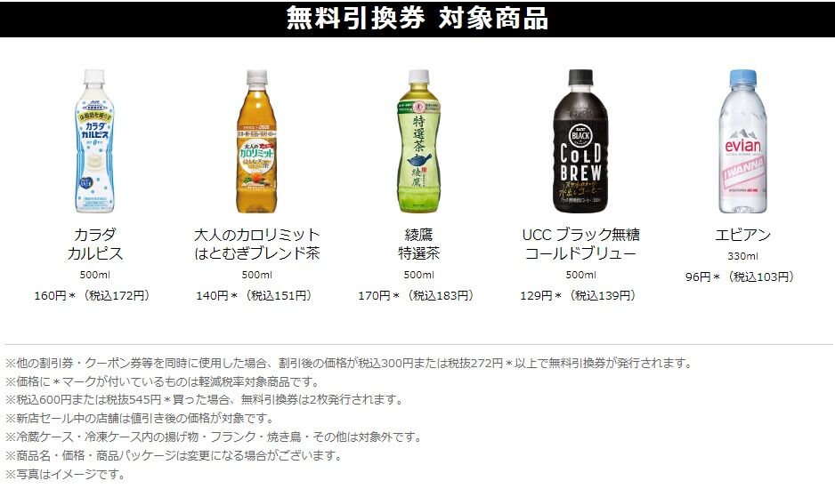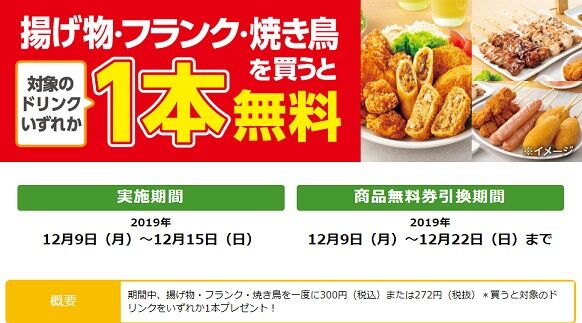 セブンイレブンにて揚げ物・フランク・焼き鳥を一度に300円以上購入すると、以下のドリンクが一本無料で貰えるキャンペーン中です。期間は12月9日(月)~12月15日(日)まで。(商品無料券引き換え機関は12月9日(月)~12月22日(日)まで))