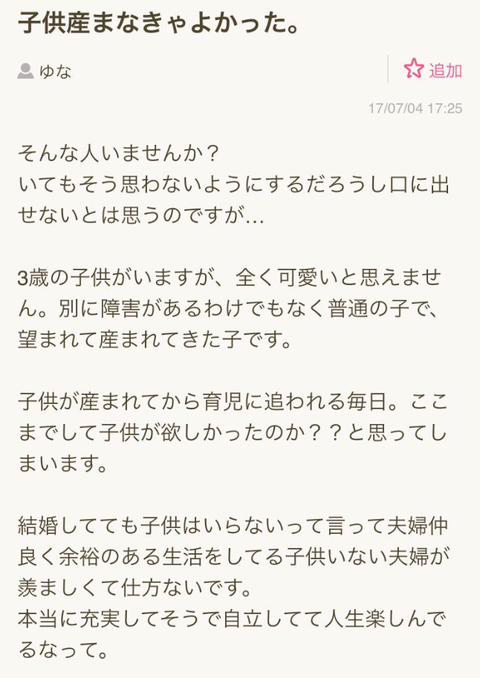 Homepage転職 masakatsu7733 7年 ago Categories: 転職 【朗報】日本人女性「あれっ もしかして子供産まないほうがよくね?」悟りはじめる 1: 風吹けば名無し 2019/01/21(月) 10:00:09.57 ID:lqYSY+uO0 「産んだ今過去に戻れるなら、確実に産まない」 「戻れるなら絶対産まない」 「失敗作と知って産まなきゃ良かったと人生最大の後悔をしている」 引用元: ・http://swallow.5ch.net/test/read.cgi/livejupiter/1548032409/ 続きを読む Source: 資格ちゃんねる キムタクと香取が久々の共演きたー » « 米国で最も優れたアクセラレータが見出した5つの暗号通貨・ブロックチェーンスタートアップ masakatsu7733: