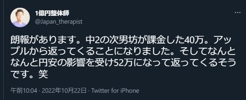 朗報があります。中2の次男坊が課金した40万。アップルから返ってくることになりました。そしてなんとなんと円安の影響を受け52万になって返ってくるそうです。笑ちょっとバズってるので正確な流れをここで確認しておこう!中2次男嫁のカードを財布からとり年齢を偽ってゲームに40万を1ヶ月かけて課金。それがバレて僕にぶっ飛ばされる。アップルとゲーム会社に返金できないか問い合わせしたところ無理でした。その後、、、消費者センターへの嫁が問い合わせ色々なやり取りを1ヶ月間続けました。担当の方が優秀だったそうで、その後アップルから52万を数回に分けてカードに返金してくれるそうです。ここまでが利回り30%叩き出した一連の流れです。