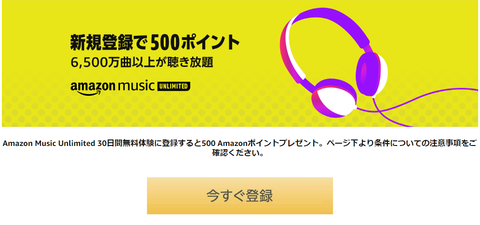 AmazonにてMusicUnlimited会員の無料体験で500ポイントがもらえるキャンペーンが開催中です。