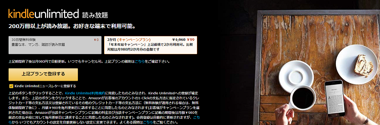 AmazonにてKindleUnlimitedが2ヶ月99円になるセールが開催中です。