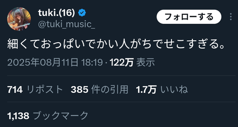 Homepage息抜き masakatsu7733 5か月 ago Categories: 息抜き 【朗報】tuki(16)「細くておぱいでかい人、がちでせこすぎる。」←これwwwwwwwww 【朗報】tuki(16)「細くておぱいでかい人、がちでせこすぎる。」←これwwwwwwwww – ラビット速報 続きを読む Source: 芸能人の気になる噂 映画館で見る予告好きな奴wwww » « 【画像】ゆうちゃみ、ナマ脇の破壊力が規格外すぎる!! masakatsu7733: