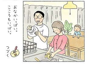 夜になって母が帰宅すると、子どもと父はそれぞれ「しろいちゅるちゅるめんめんたべた」「ぽんこつらーめん」と報告し、母は一瞬疑問に思うものの、台所に置かれたマルちゃん正麺の袋を見て、「ああ ぽんこつラーメンね」と納得。最後のコマでは、母が台所に置かれたままだった昼食の器と鍋を洗い、その隣で夫がお皿を拭いているという場面が描かれていた。