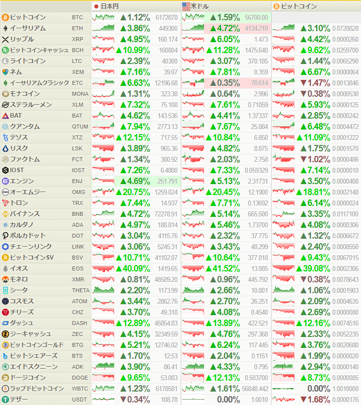 仮想通貨はダウの上昇に合わせて上昇し、全体的に好調となっているお。