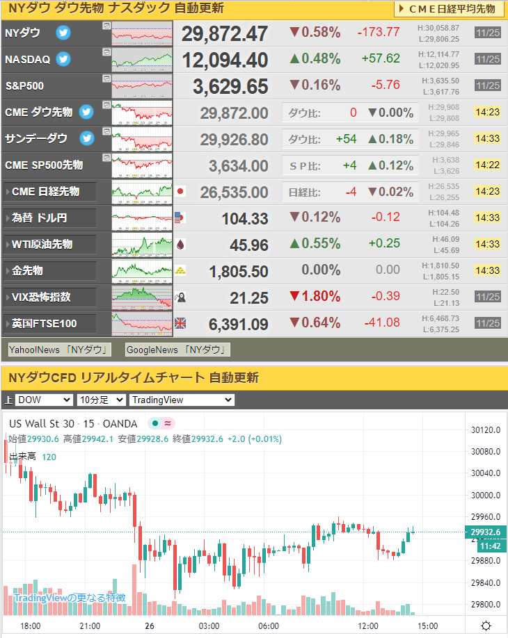 25日のダウは3万ドル達成の利確売りに押されたのか、わずかに下落。
