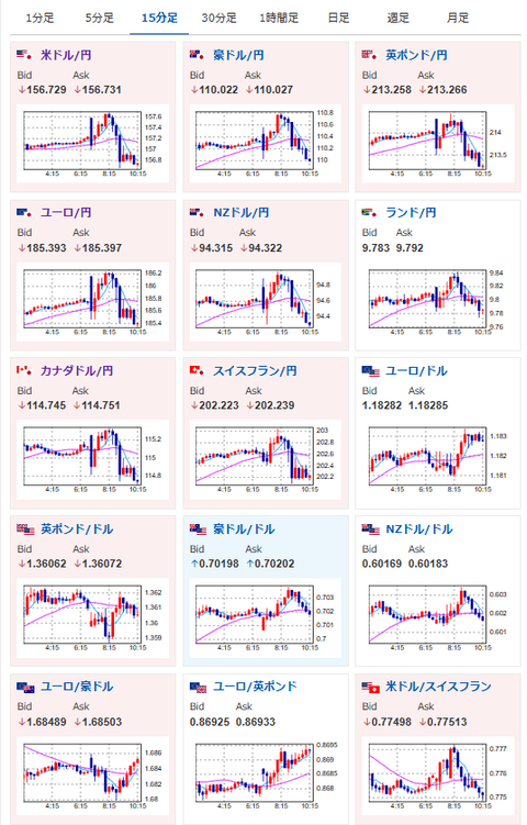 初動では市場予想通り円売り、株買い、金買いが入っていたのだけれど、途中から円売りだけが抑えられた形で156円台に押し戻されているお。