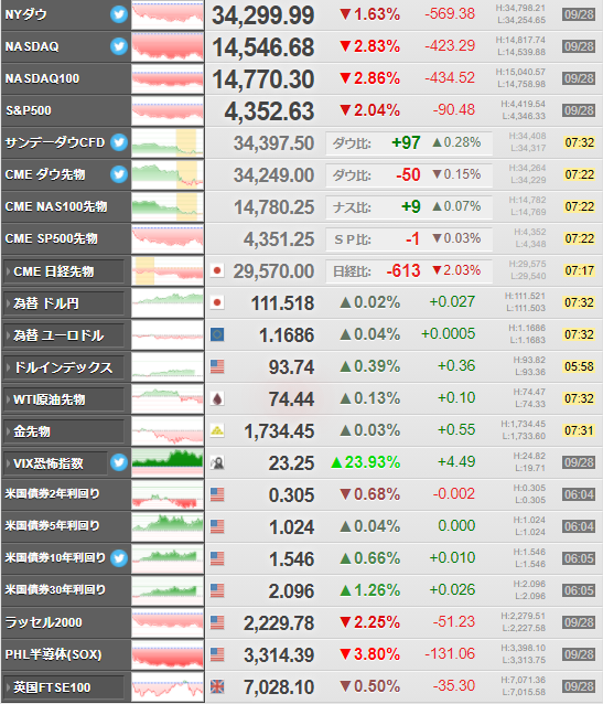 株価に関してはテーパリングや債務上限問題、利上げ期待などのリスクが意識され大幅下落だお。