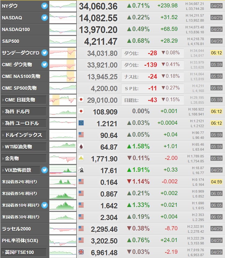FRBのテーパリングに関しても気になるので、株価の上値が重くなったり下落に転じる場面が出ないかには注目だお。(一応今のところは右肩上がりだと思っているお)