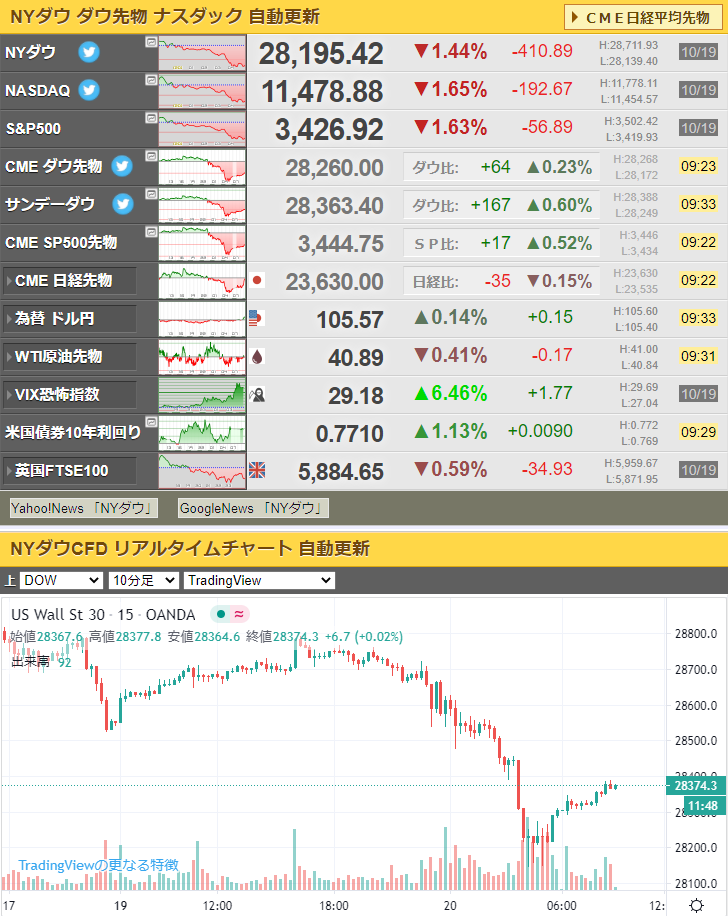 19日の米株価指数は先行き不透明感からがっつりと下げてきたお。