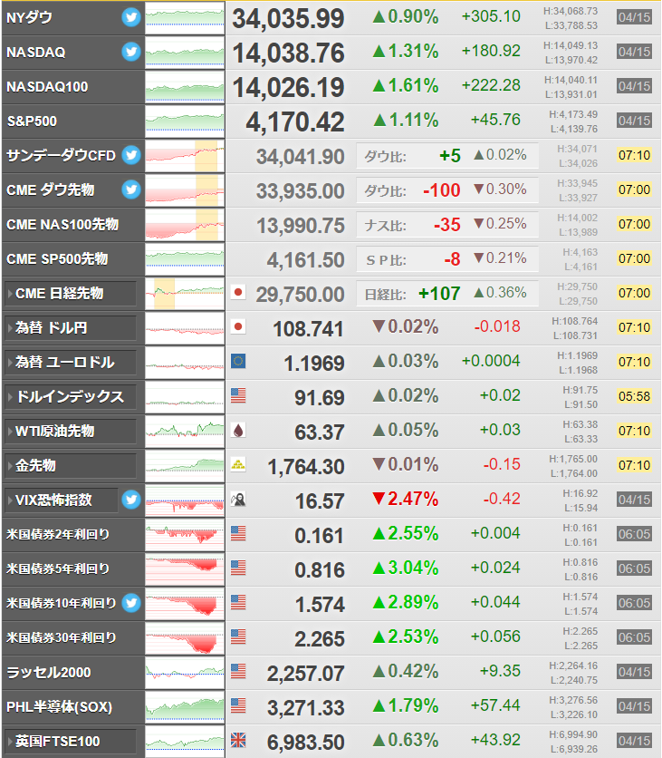 15日の米国時間では好調な米国経済指標により米株価指数が軒並み上昇。