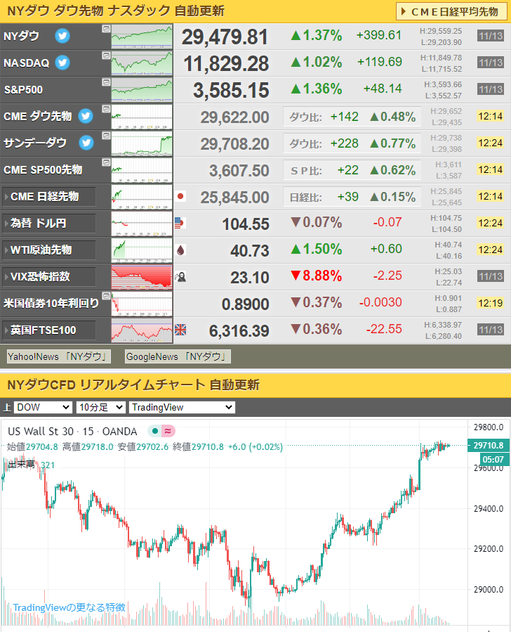 日経平均は一時400円超高、ダウ先もそれに引っ張られており、今日も株高が期待できそうだお。