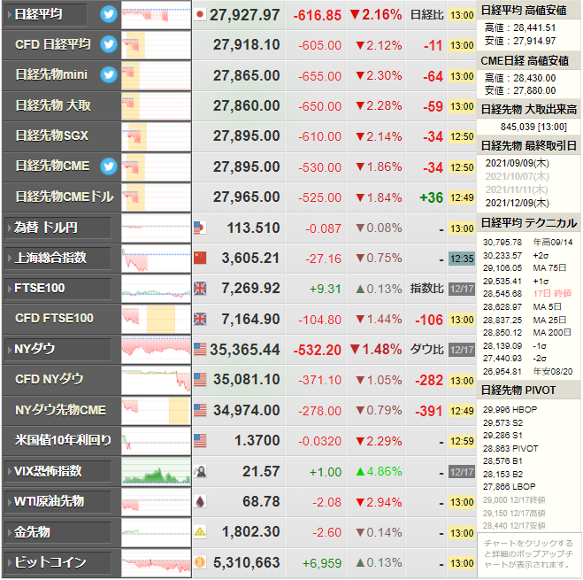 本日の日経平均は大きく下落、ダウ先もかなり下げているお。