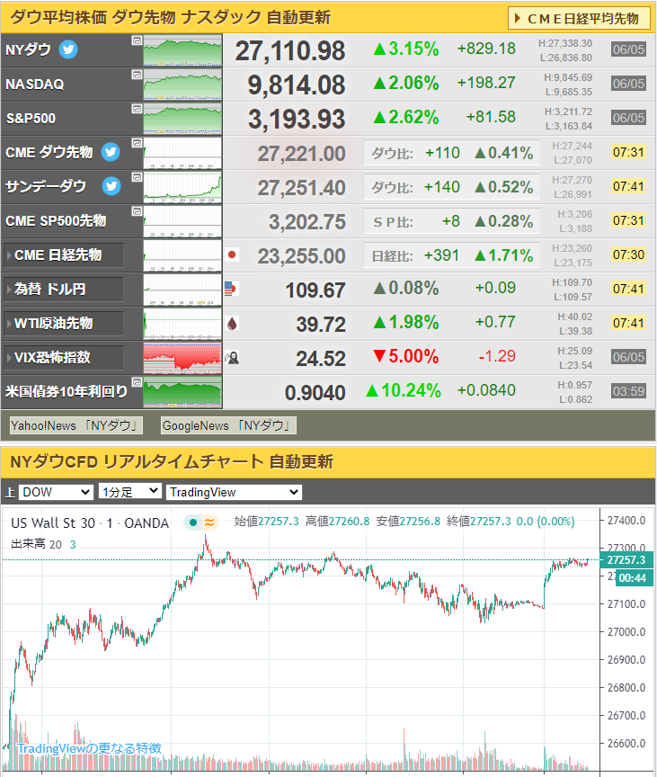 またNY州の夜間外出禁止令が1日早く解かれた事、追加経済対策期待、先週の雇用統計の結果等から先物市場は上昇してのスタートだお。