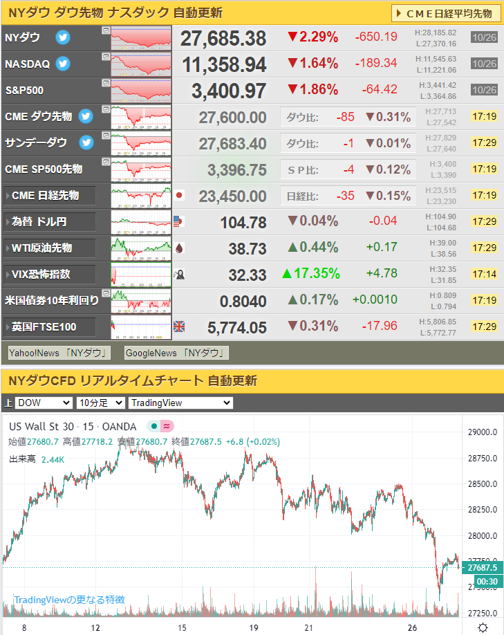 昨日のダウは非常に大きな下落をしていたものの、ペロシ下院議長がムニューシン財務長官と協議を行うと発表したあたりで一服。
