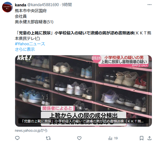 熊本市の小学校で、児童の上靴に尿がかけられた事件の続報です。学校に侵入した疑いで4月に逮捕された男が、上靴に放尿した器物損壊の疑いで書類送検されたことが分かりました。