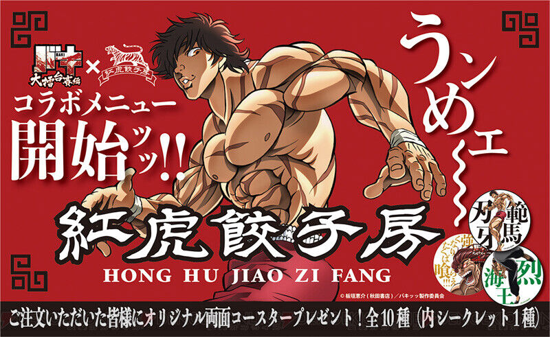 『バキ』範馬刃牙復活ッッ滋味滋養コースがおいしそう! これが烈海王のおもてなしだッ!!TVアニメ『バキ』大擂台賽編と中国料理店・紅虎餃子房コラボで提供されるコラボメニューの詳細が公開されました。<紅虎餃子房 銀座コリドー街限定>烈海王がもてなす範馬刃牙復活ッッ滋味滋養コース(予約制)価格:おひとり様 4,800円(税抜)メニュー:前菜(自家製ローストビーフ・よだれ鶏 鶏肉と茄子の辛味ダレ)/点心(特製五目春巻き・すっぽん小籠包)/肉(豚ロース肉と香菜の強火炒め・鶏手羽1本取りのスパイス揚げ)/魚(白身魚と大豆のチリソース)/麺(薬膳湯麺 丸鶏と薬膳コトコト煮込んだ滋養スープ麺)/デザート(梨と白きくらげのコンポート・復活の例のアレ)/オリジナル特大テーブルランチョンマット特典:コースター10種コンプリート付き
