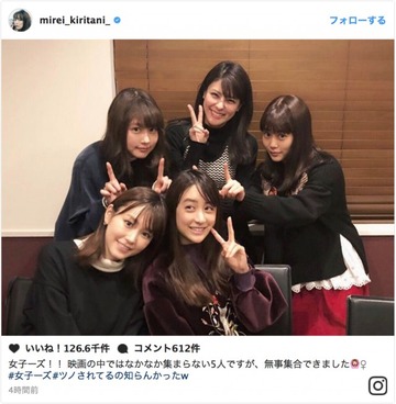 怪人を倒すことよりも「まつエク」を優先するメンバーがいるなど、劇中ではなかなか全員がそろわなかった『女子ーズ』。桐谷はこの日、「女子ーズ! 映画の中ではなかなか集まらない5人ですが、無事集合できました」というコメントをつけて写真を投稿。フォロワーからは「美女しかいない!」「この作品見ました」「すごい豪華ですね!」といった声が上がっていた。