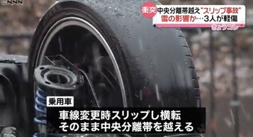 東京・調布市で雪でスリップした乗用車が中央分離帯を乗り越えて横転し、反対車線を走る軽乗用車と衝突しました。