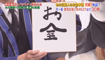 そんな舛添要一さんが、番組のスタジオで実際に書道の腕前を披露。お題は「お金」で、周りから「おお!」と言う声も挙がるが有吉が「『おお!』って言う程のものか?」と笑う場面も。書き終わると「あまりうまく書けませんでしたけど」と完成品を見せた。「味がある」と言う人もいれば小柳ルミ子さんはそれに対して「味があるか?」と否定する人も。