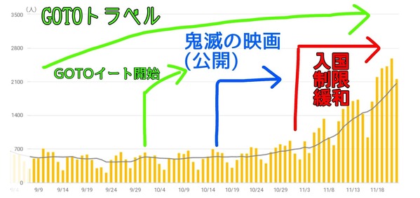 鬼滅の映画とGotoイートが感染を広げたという意見が多かったのでグラフに追加。