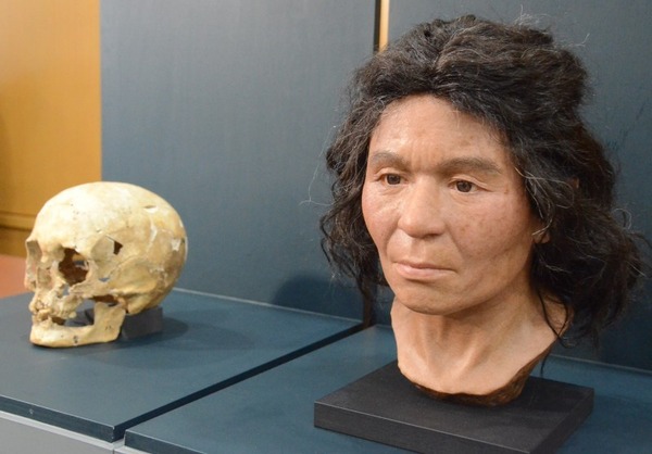 ゲノム情報を使って復元された縄文人女性の顔(右)とその基となった頭骨=東京都台東区上野公園の国立科学博物館で2018年3月12日午前10時52分、荒木涼子撮影