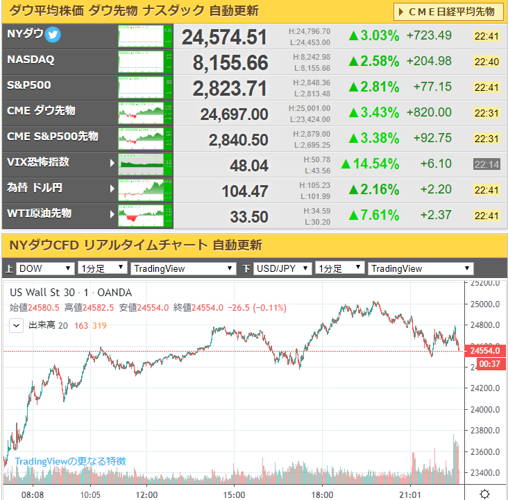 先物で強烈に上げていたダウはじわじわ下げているところだお。