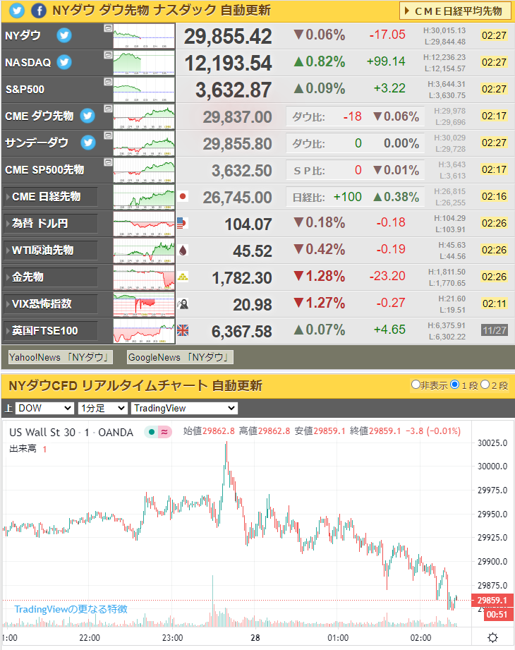 オープン時には伸びていたダウも時間が経つにつれて下落中だお。