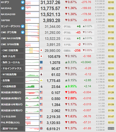米債利回りが上昇しすぎる事によって、株価の上値の重しになっているという報道は見つけていたけれど、現在は米債利回りも下落中だお。