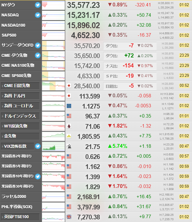 金融緩和正常化や米中関係悪化でハイテク株売りと言われていたけれど、ダウは600ドル超安から350ドル安くらいまで戻したお。
