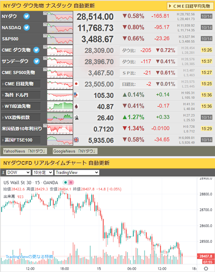 マイナス材料も重なりダウ先は段々落ちてきているお。