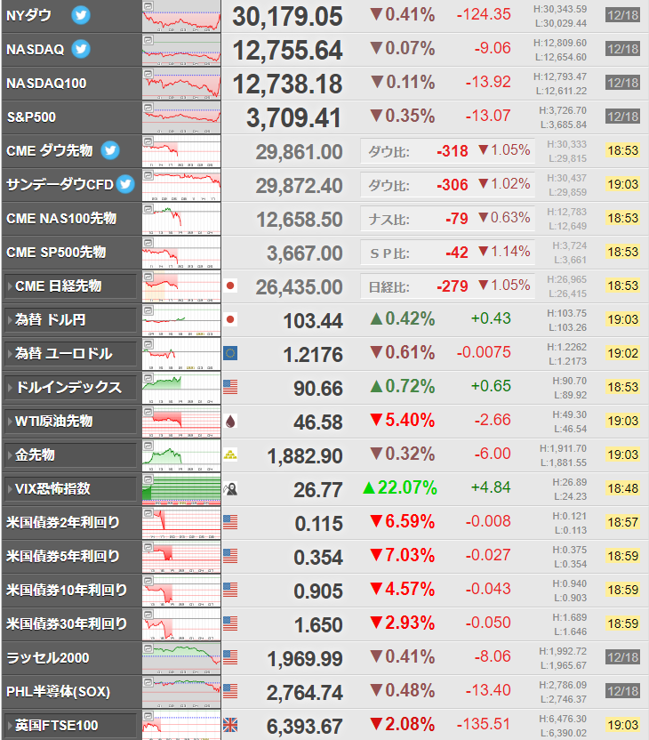 【相場】ダウ先の下げがヤバイ模様 追加経済対策は合意もコロナ亜種の懸念が強すぎか