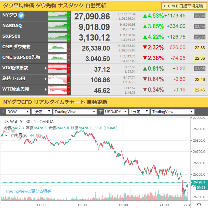 ドル円は下が支えられているものの、ダウ先は大幅に下落中。