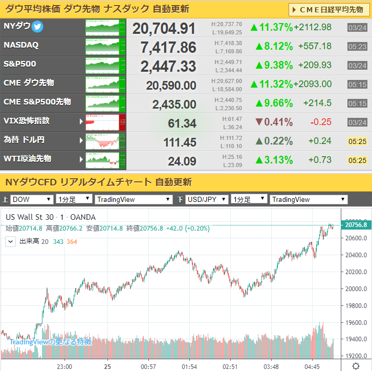 【相場】ダウ爆上げ!米国経済対策期待で2100ドル超のプラス
