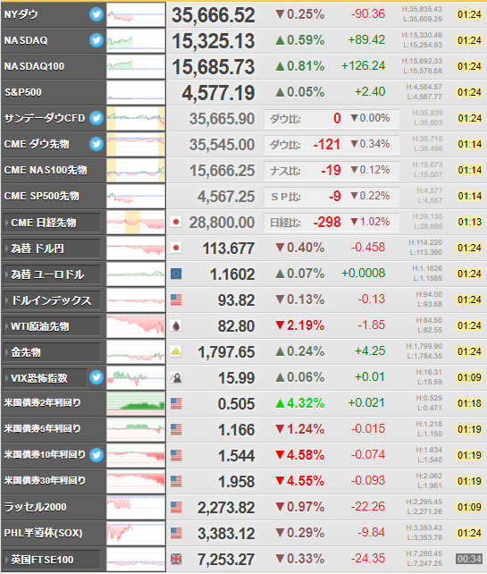 ダウは軟調だけれど、好調な米企業決算で全体としては強め。(ボーイング(ダウ採用銘柄)が市場予想以上の赤字)