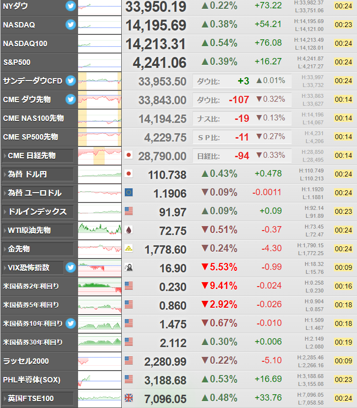 米国株価指数は上昇、テーパリングは一気には進まないのではという見方だお。