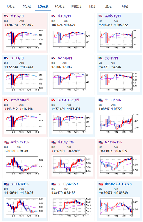 レンジの範囲内ではあるけれど、159.3円あたりでは介入への警戒感も出ているかなというような動きに。