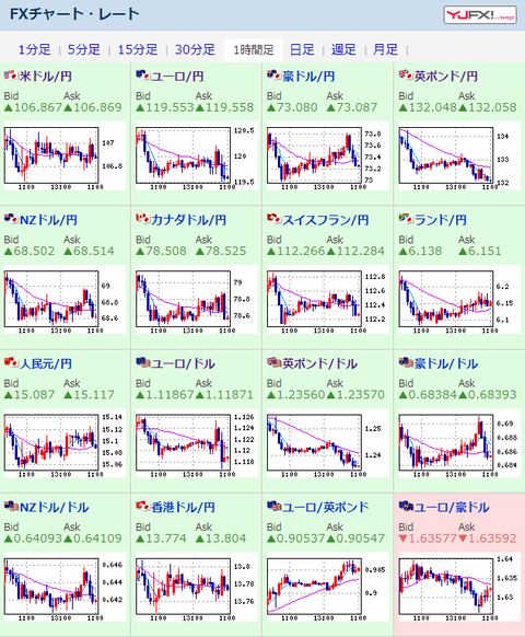 通貨はユーロ、ポンドがかなり安く、ドル円はやや円高に寄りながらのレンジ圏だお。