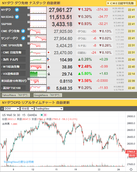 ダウは既に400ドル超の下げ、またリスク回避のドル買いが進みドル円は1ドル105円台に一瞬乗せたお。