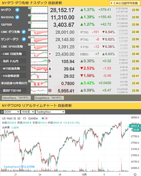 ダウ先はちょっと怪しい動きをしていたけれど現物は結局爆上げじゃないかお。