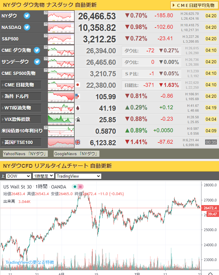 米株指数は本日も下落、ドル円は3時45分ごろ一旦106円付近まで戻したお。