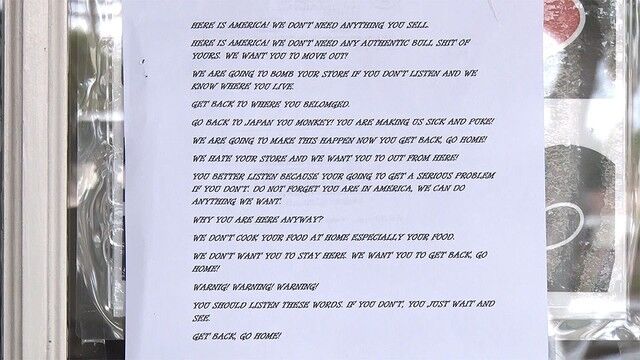 アメリカで人種差別に対する抗議活動が続く中、カリフォルニア州の日本人経営の店が爆破予告を受けたことがわかり、現地の日本総領事館が注意を呼びかけている。15日早朝、トーランス市で、日本人経営の調理器具の店に、「日本へ帰れ。言うことを聞かないと爆破する」などと書かれた脅迫文が貼られているのが見つかった。