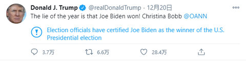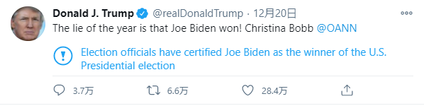 Twitterはこれまでにも数々のトランプ大統領のツイートに対して「事実に反する可能性」などとユーザーに対する警告のラベルをつけてきましたが、その最新のものは「選挙当局はジョー・バイデンを米国大統領選挙の勝者として認定しています」と赤い太字で付された警告ラベルの文字はTwitterの公式選挙ページへのリンクになっており、そこにはさまざまな報道機関の報道内容が示されています。Twitterの広報担当は「2020年米国大統領選挙の結果が確定したため、最新の情報を反映してラベルの文言を更新した」としています。トランプ氏はまた、政府機関を標的とした一連のハッキング被害に関してもポンペオ国務長官がロシア政府支援のハッカーグループの為業出あることを示唆したにもかかわらず中国が黒幕だとするツイートをしています。トランプ氏に限らず選挙結果に異議を唱える動きに関しSNSやIT巨人と呼ばれる企業はすでにジョー・バイデン氏を次期大統領だとする「公に認められた結果」に対する誤った情報の拡散には厳しい態度で臨む構えをとっています。Twitterは、トランプ氏を含む ”世界の指導者と公職の候補者” が在職中に事実と反する発言をしても、「公共の利益のため」それを強制的に削除することはしていません。しかし、2021年1月20日にトランプ氏が任期を終えれば、以後はこのような保護措置は適用されなくなるとされます。もしその後もトランプ氏がいまのように乱暴な内容や、軽く錯乱したような(事実と異なる)内容のツイートを繰り返すようならば、Twitterがさらに厳しい対応をとるようになることは避けられないと考えられます。