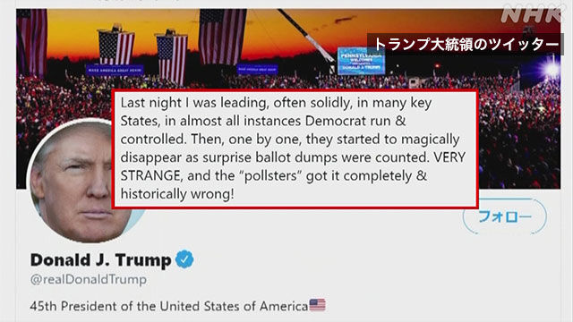 アメリカで大統領選挙の結果が判明しないまま一夜明けた4日午前10時すぎ、日本時間の5日午前0時すぎ、トランプ大統領はツイッターに「私は昨夜の時点でほとんどの場合、民主党の知事が治める主要な州で確実にリードしていた。しかし、突然出てきた票が集計され始めると、それが次々と魔法のように消えていった。とても不思議だ」と投稿しました。AP通信の集計などでは激戦州のミシガンなどで当初、トランプ大統領がリードしていましたが、郵便投票の開票も進む中、バイデン氏と激しい競り合いになったため、こうした状況を指摘しているものとみられます。そして「世論調査の専門家を名乗るものは完全に間違っていて、これは歴史的な過ちだ」としたうえで、その後の投稿で「郵便投票の票の束を集計するたびに、なぜこんなに票差が変化し、なぜこんなに破壊力があるのだ?」と記し、郵便投票について改めて不正を主張して、不満を示しました。また、「彼らはペンシルベニアで当初あった50万票の差を早く消してしまおうとやっきになっている。ミシガンや他の場所でも同様だ」「彼らはバイデンの票をあちこちで見つけてまわっている。アメリカにとってとてもまずいことだ」と投稿しました。一方、一部の投稿について運営会社は、誤解を招く可能性があるとして注意を呼びかけるとともに、自動的には表示されないようにする措置をとりました。■「いずれの州でも大きくリード」一方的に宣言トランプ大統領は勝敗を大きく左右する激戦州、中西部ミシガン州でバイデン氏が勝利したと各メディアが伝えた直後、ツイッターに投稿し、「ペンシルベニア州やジョージア州、ノースカロライナ州の選挙人は私たちが獲得した。いずれの州でも私たちは大きくリードしている」と一方的に宣言しました。2020年11月5日 7時28分https://www3.nhk.or.jp/news/html/20201105/K10012695801_2011050514_2011050517_01_02.jpg