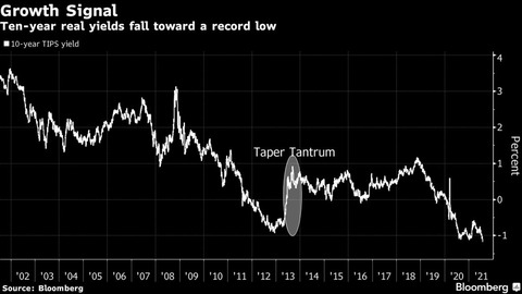 政策発表後に米10年国債利回りは一時1.7ベーシスポイント(bp、1bp=0.01%)低下して1.22%になった。3月終わりごろに付けた1年ぶり高水準の1.77%からの低下が続いている。さらに驚くべきことに、一部投資家が長期的な成長見通しの指標と見なす10年物の実質利回りは過去最低のマイナス1.17%となった。
