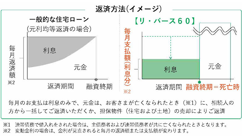 60歳を過ぎると仕事をリタイアしている人も多く、定期的な収入が年金のみという場合が多い。また、新たに住宅ローンを組みたくてもローン完済までの期限が限られており、毎月の返済額が大きくなる場合もある。何より限られた生活費から毎月の返済をするのは難しい。そこで新しく満60歳以上の人向けのリバースモーゲージ型の住宅ローン【リ・バース60】が生まれた。通常の住宅ローンでは、毎月、元金と利息を返済しなければならないが、【リ・バース60】では、債務者の存命中は、毎月の支払いは利息のみ、元金は、債務者が亡くなったときに担保不動産を売却して返済するか、相続人が現金等で一括返済するかを選ぶことができる。■新居への住み替え資金を用意したい子どもが独立した後、夫妻2人で暮らしやすいコンパクトな家への転居を検討する場合、高齢になってから住宅ローンを借りるのは難しい。しかし今後の生活のために預貯金も一部残しておきたい。→【リ・バース60】なら、一定の頭金は必要だが、高齢の夫婦でも住み替え資金を借りることができ、毎月の返済負担も小さく済む。■シニア向け分譲マンションを購入したいこれから歳を重ねるにあたって1人暮らしは不安だと感じる。あるいは今の住まいのメンテナンスに手がかかり、今後、自分が病気になったときの対処も考えておきたい。→【リ・バース60】なら、看護師の常駐や健康管理のための施設が備え付けられているなど、快適な老後を想定したシニア向けの分譲マンションへの住み替えにも利用できる。融資限度額は担保評価額の50~60%となっている。そのため、住宅の建設・購入資金の借り入れの場合は物件価格の50%程度の頭金が必要になる。2020年度の申請戸数は対前年の118%増、さらに2021年の1月~3月の申請戸数は対前年同期比135.6%増という【リ・バース60】。取扱金融機関も70を超え、今後ますます注目される住宅ローンと言えるだろう。2021年7月8日 07:00