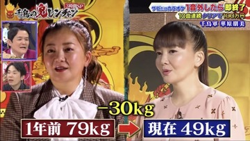 お笑いコンビ「千鳥」のノブは「人変わってるやん」と驚きの表情。華原は自身の変貌に「(1年前の)79キロから49キロに。個人でずっとパーソナルトレーニングやってて…」と説明。